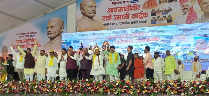 आद्य क्रांतीवीर राजे उमाजी नाईक यांच्या शासकीय जयंती निमित्त भिवडी तालूका पुरंदर येथे राज्याचे मुख्यमंत्री देवेंद्र फडणवीस, राज्याचे बांधकाम मंत्री छत्रपती शिवेंद्रसिंहराजे भोसले, आ. गोपिचद पडळकर, आ. विक्रम पाचपुते, भटके विमुक्त वंचित बहुजन समाजांचे दौलत नाना शितोळे, वंजारी महासंघाचे अध्यक्ष गणेश खाडे आदींनी उपस्थितांना हात उंचावून साद घातली.
